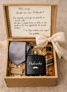 Outra ideia é montar um pequeno kit com itens que os padrinhos possam usar ou guardar como lembrança.
