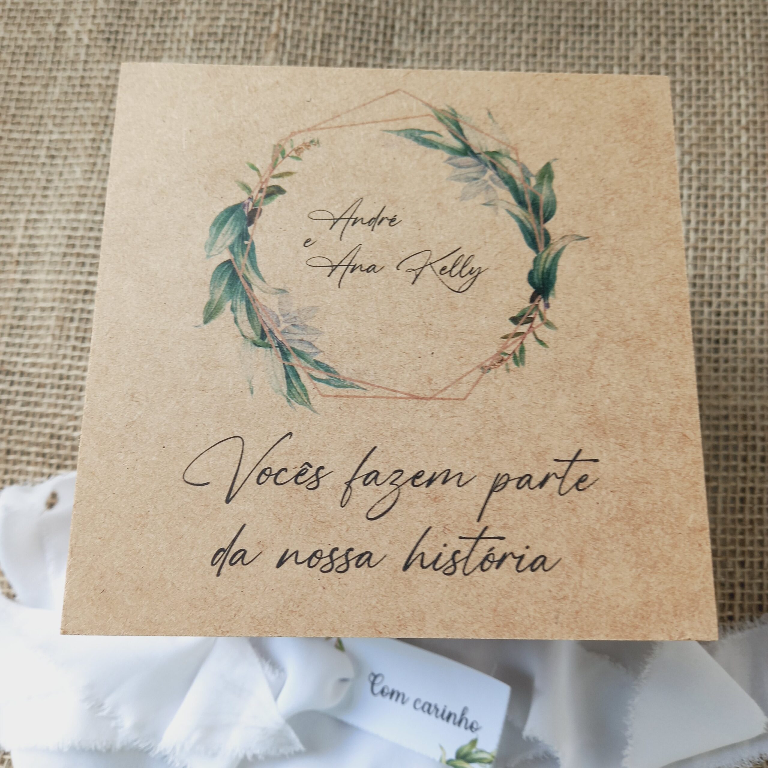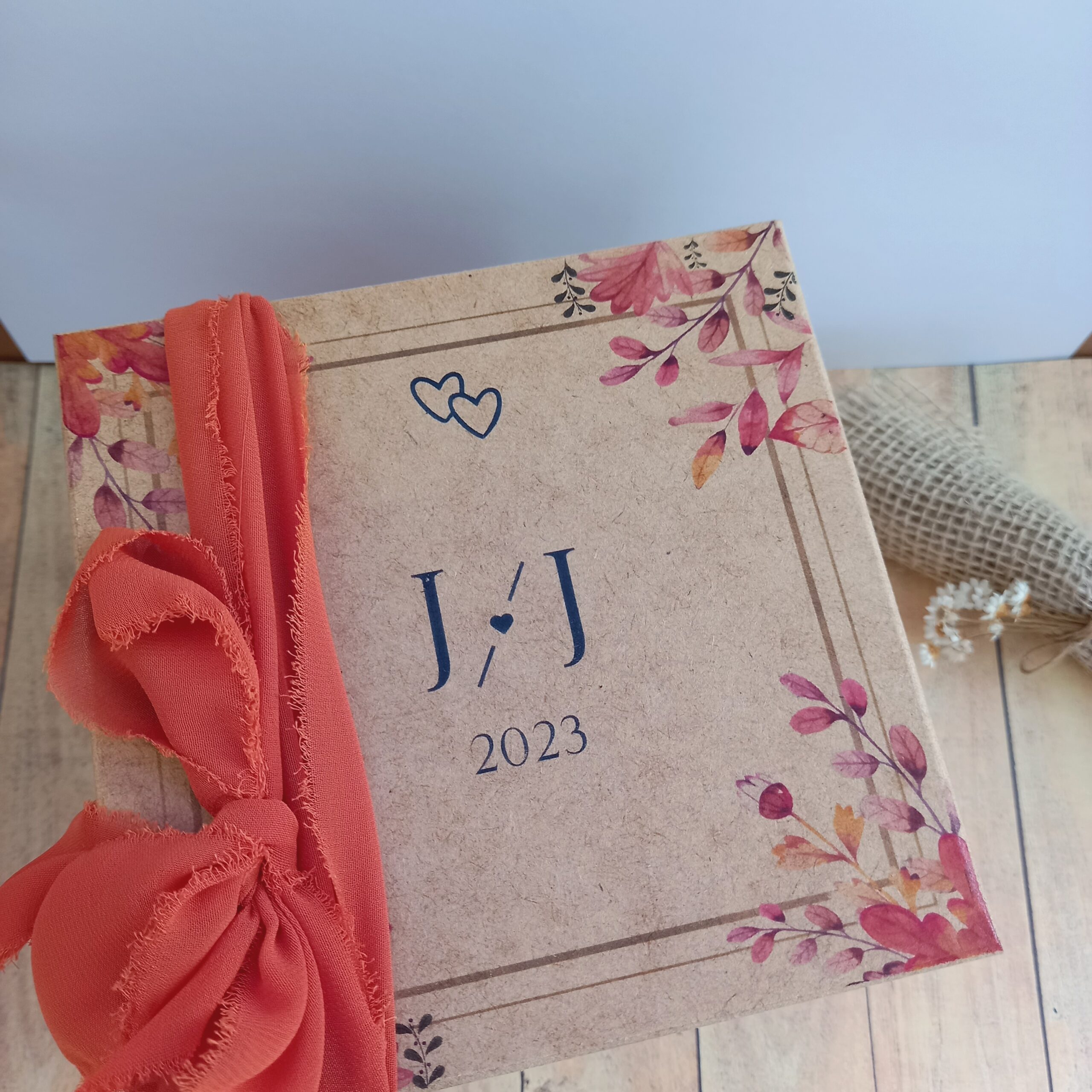 – Na caixa: nome ou iniciais dos noivos, floral/folhagem, data, pequena frase,